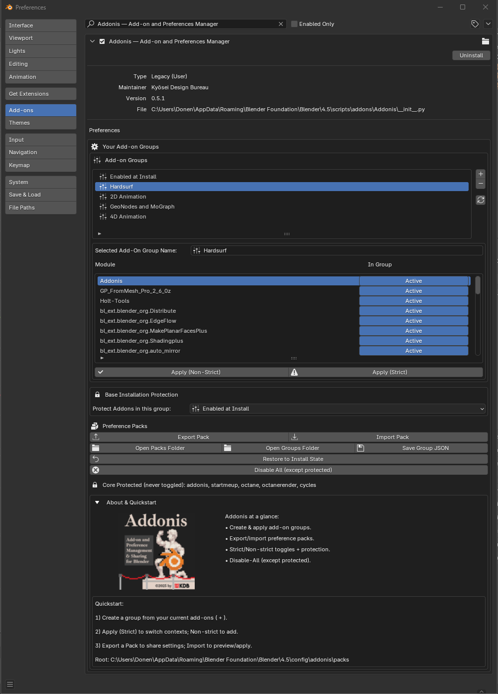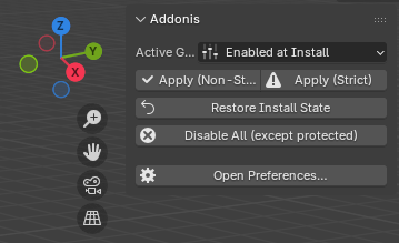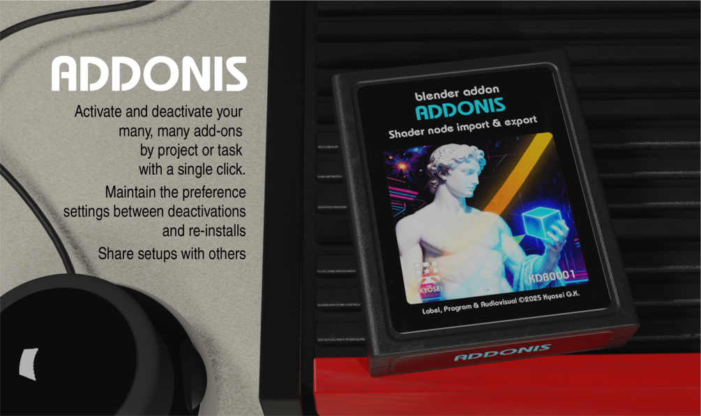 Addonis helps you organize and tame your (probably hundreds) of Blender add-ons! Group and mass enable/disable, all while persisting your settings.